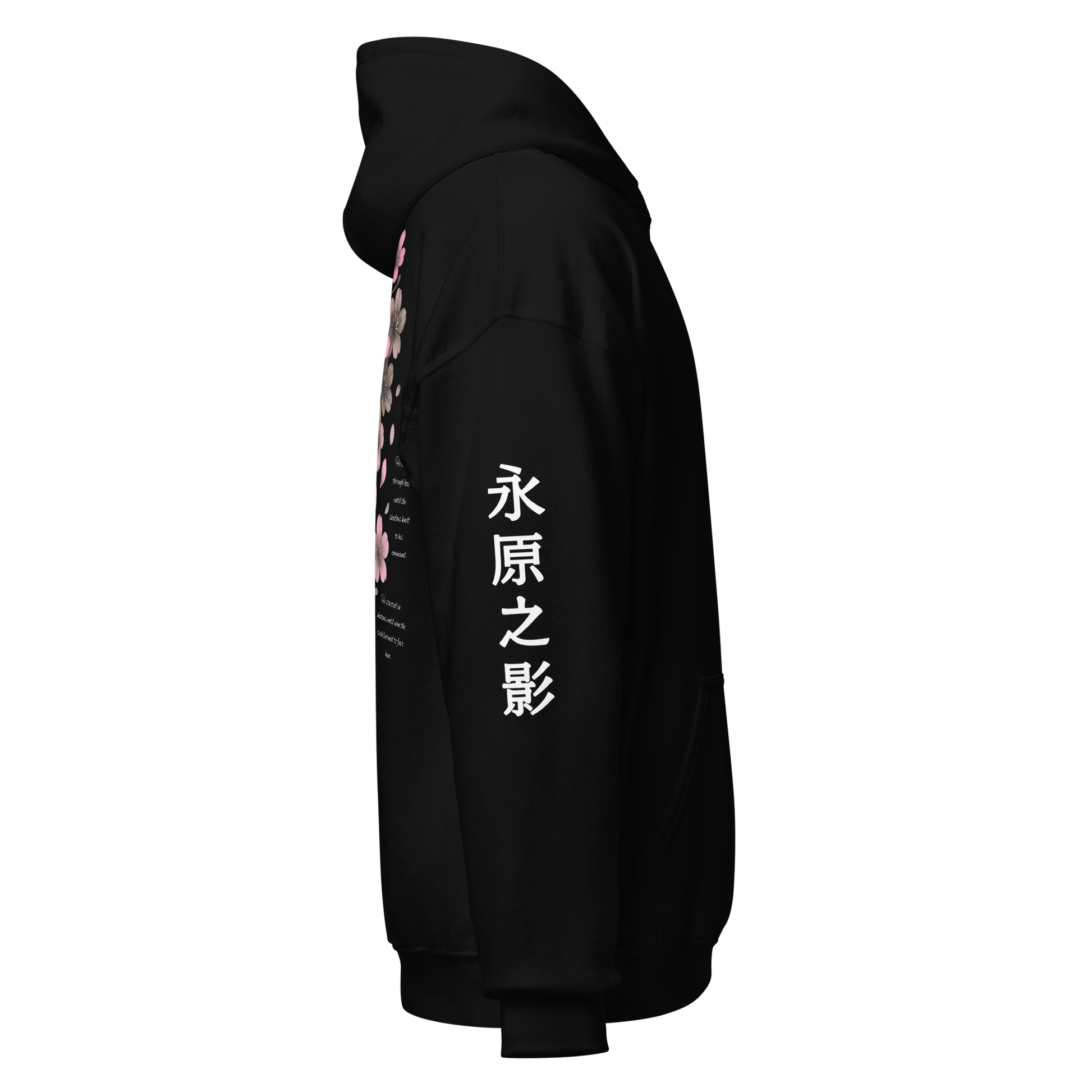 The back graphic unfolds like a memory in bloom — dark cherry blossoms emerging from the abyss, surrounding the vertical ARISE text in a call for rebirth. Each petal represents growth through adversity; each shade of pink to gray mirrors the balance between humanity and power. Subtle kanji embroidery on the sleeves — 影之主宰 (Lord of Shadows) and 永遠之影 (Eternal Shadow) — anchor the design with a quiet authority.