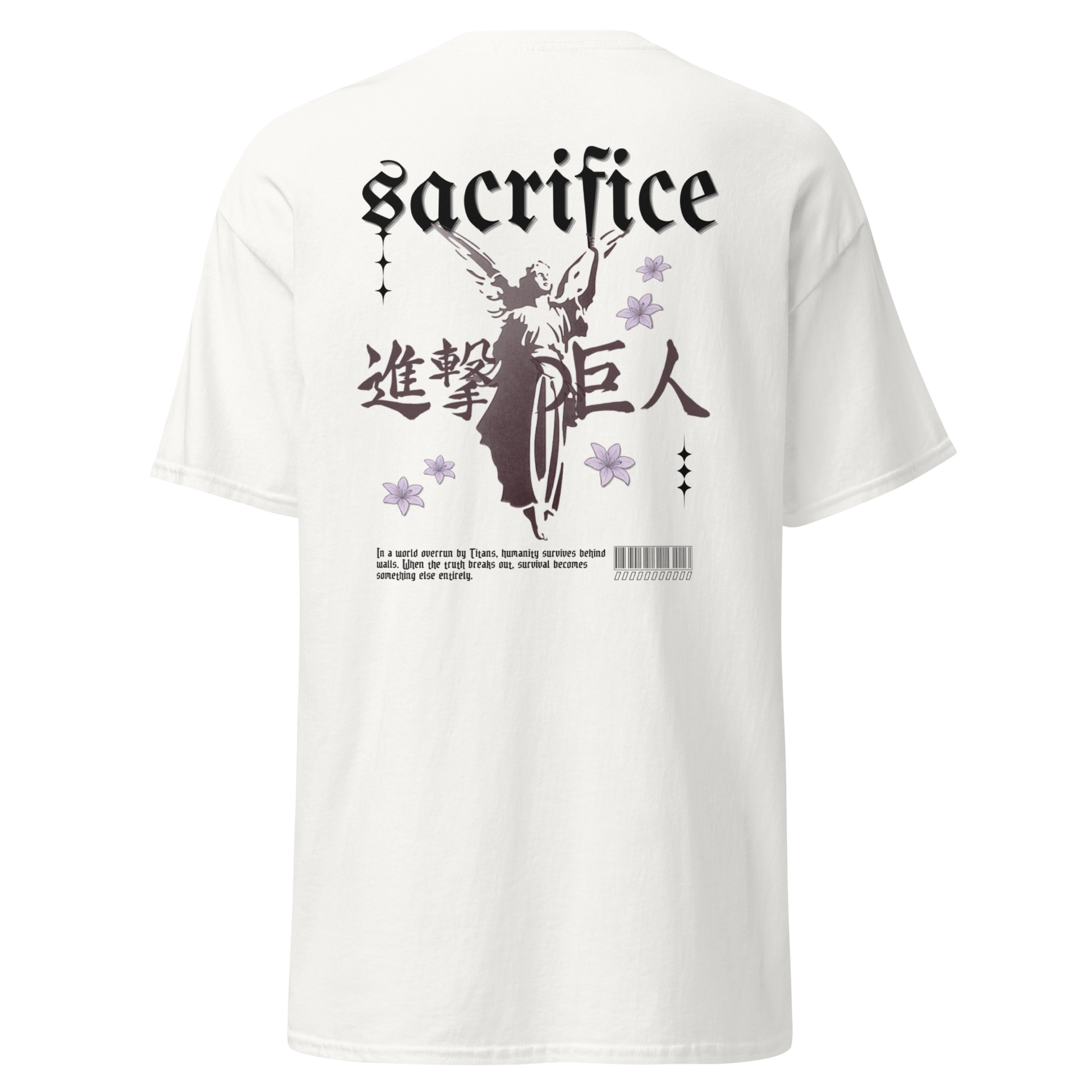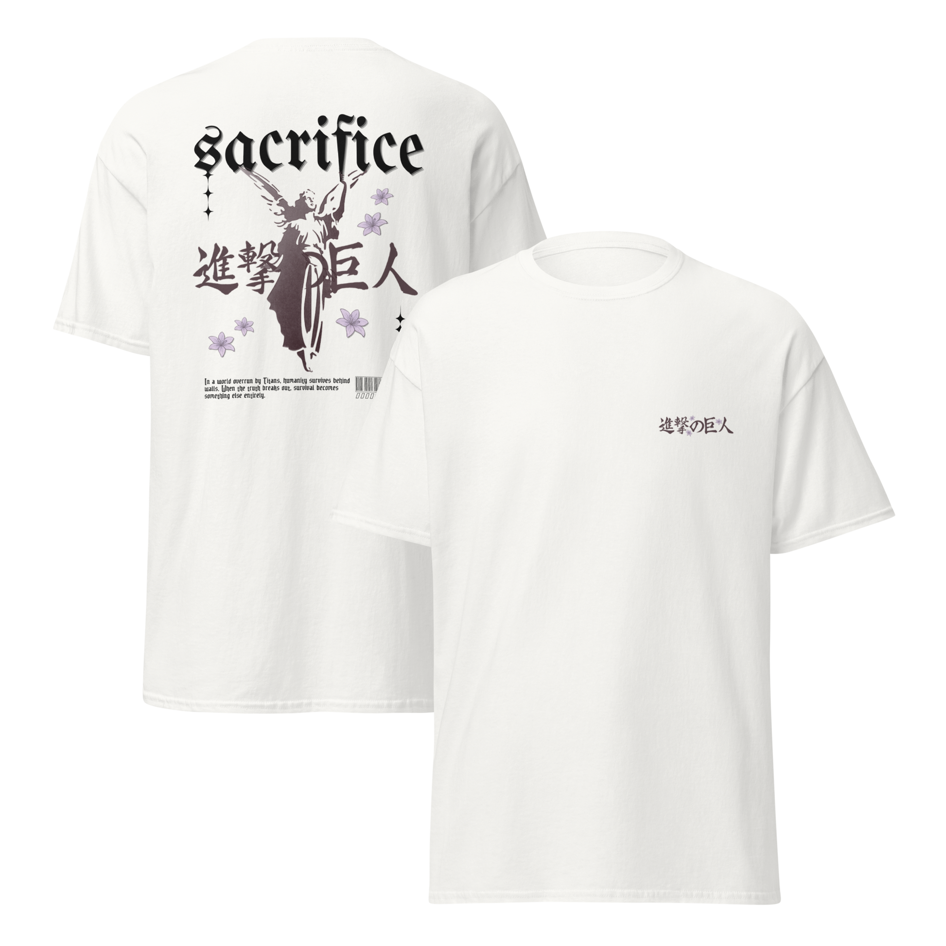 The 100% cotton unisex classic tee, Sacrifice, merges anime-inspired streetwear with powerful symbolism. The front features Attack on Titan’s title framed by delicate flower blossoms, creating a quiet elegance. On the back, a striking angel stands at the center, embodying the tension between hope and loss. Balanced with clean lines and heavyweight fabric, this piece carries both visual impact and narrative weight, made for those who wear their story.